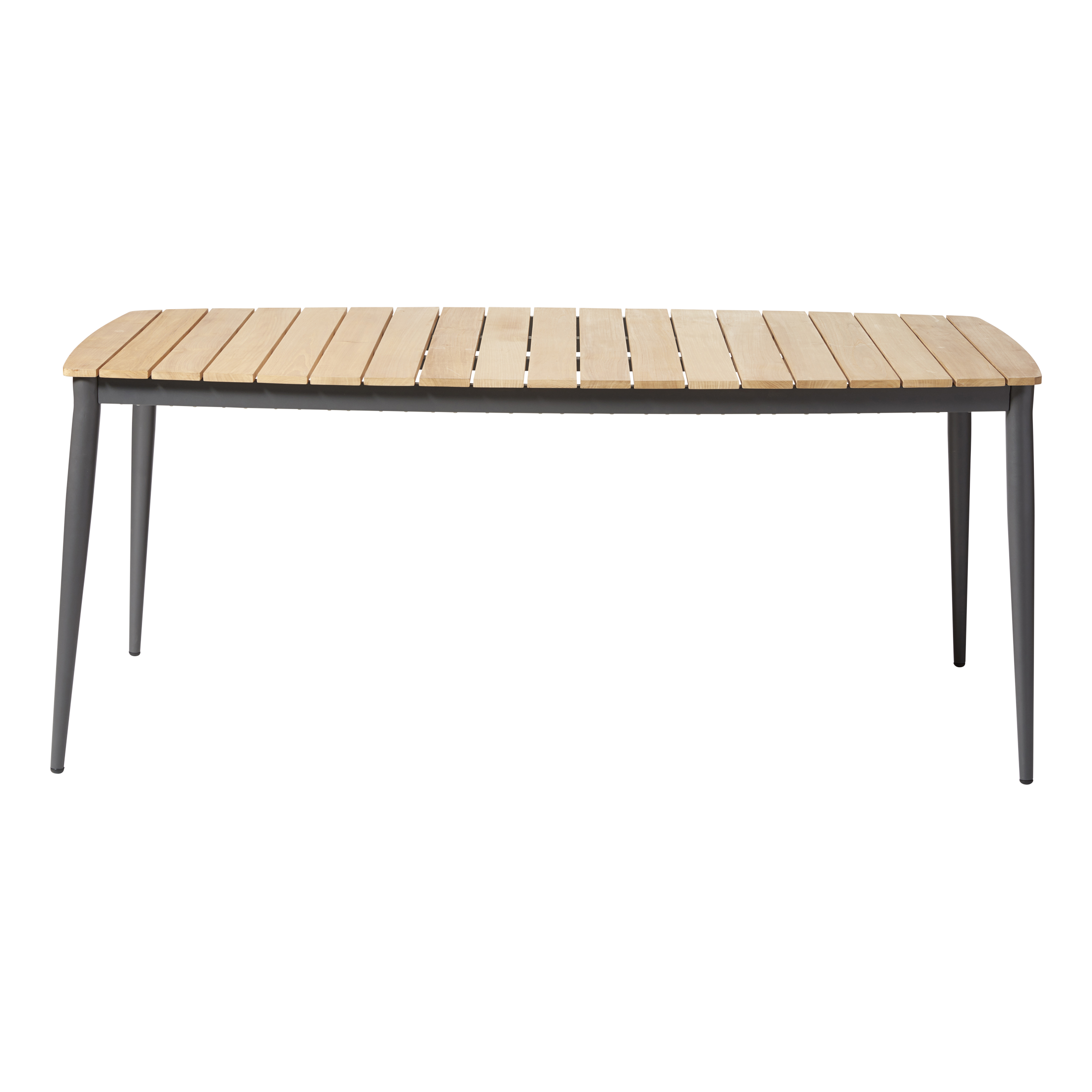 Ein eleganter Outdoortisch, der pulverbeschichtetes Aluminium in Anthrazit mit einer Tischplatte aus warmen Teakholzlamellen kombiniert.