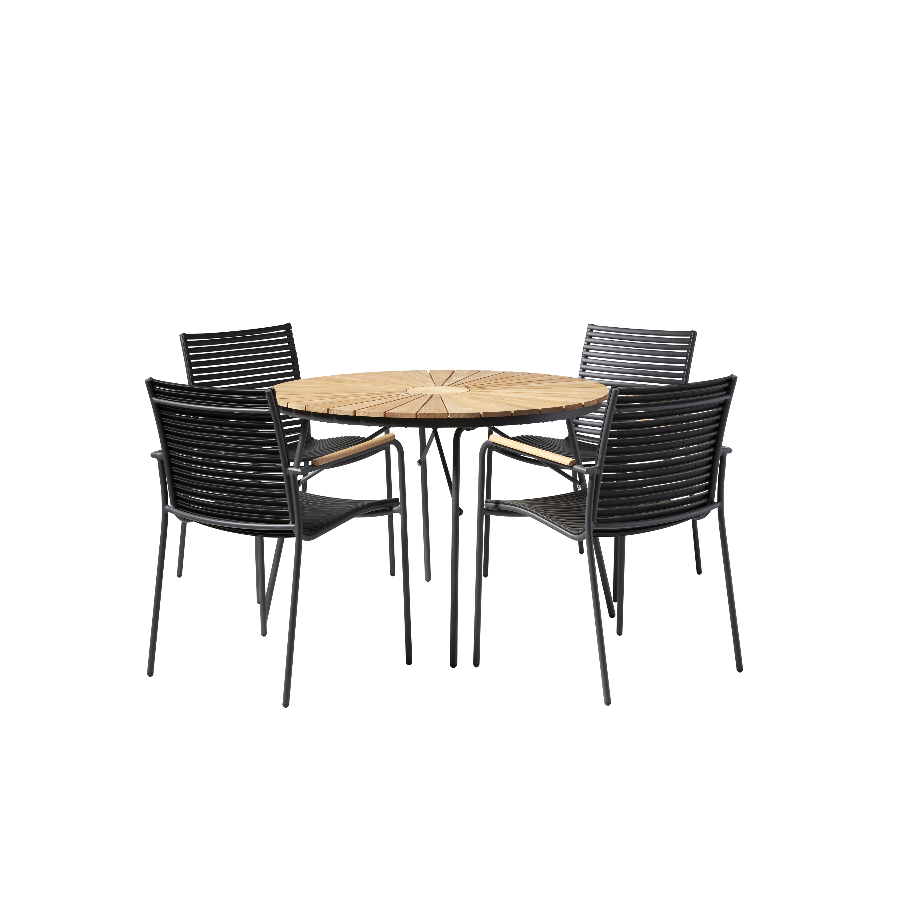 Der Ellen Tisch mit einem Durchmesser von 110 Zentimetern bildet zusammen mit vier Mood Classic Stühlen ein harmonisches und stilvolles Outdoor-Set, in dem klassisches Teak auf grafische Leichtigkeit trifft.