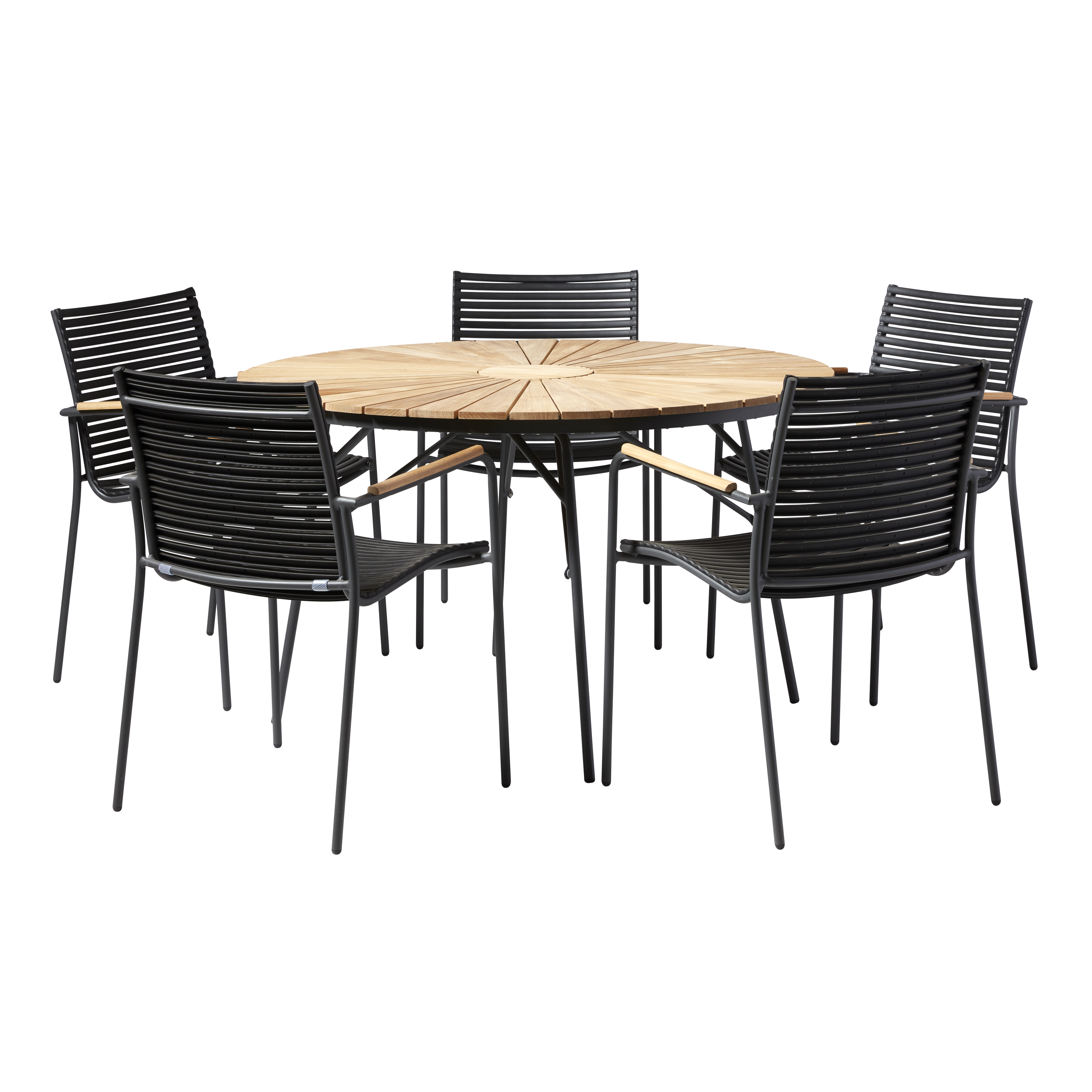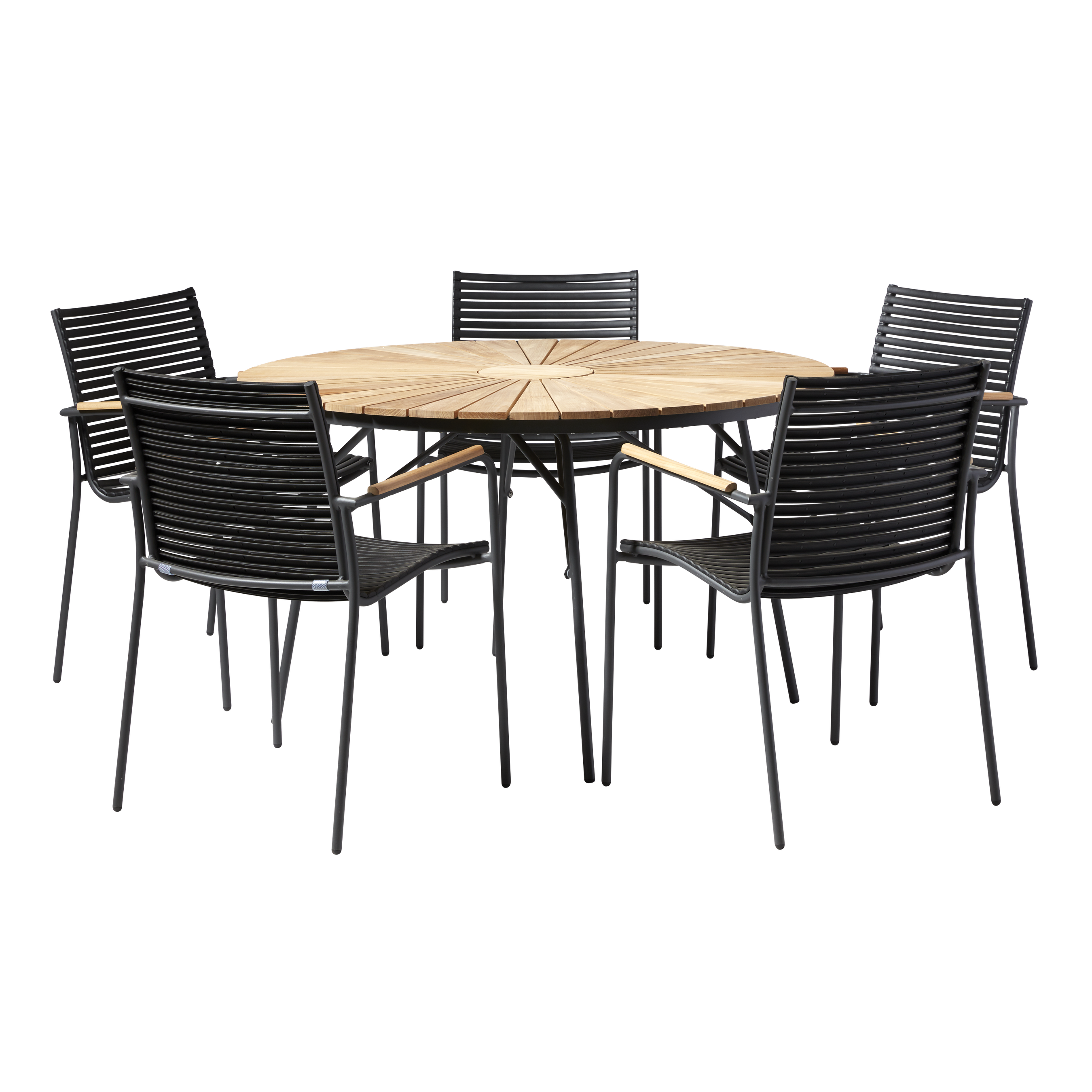 Die runde Form schafft einen natürlichen Treffpunkt, während die schlanke Silhouette und das markante Lamellendesign der Stühle dem Set Charakter und Struktur verleihen.