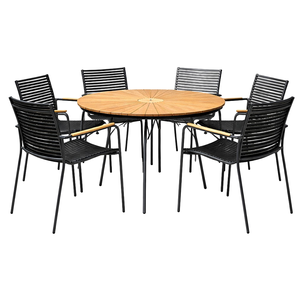 Der größere Durchmesser schafft einen natürlichen Treffpunkt, an dem sowohl Alltag als auch Gäste ihren Platz finden. Die runde Form lädt zu Gesprächen und Gemeinschaft ein, während die schlanke Silhouette und das markante Lamellendesign der Stühle dem Set Struktur und grafischen Charakter verleihen.
