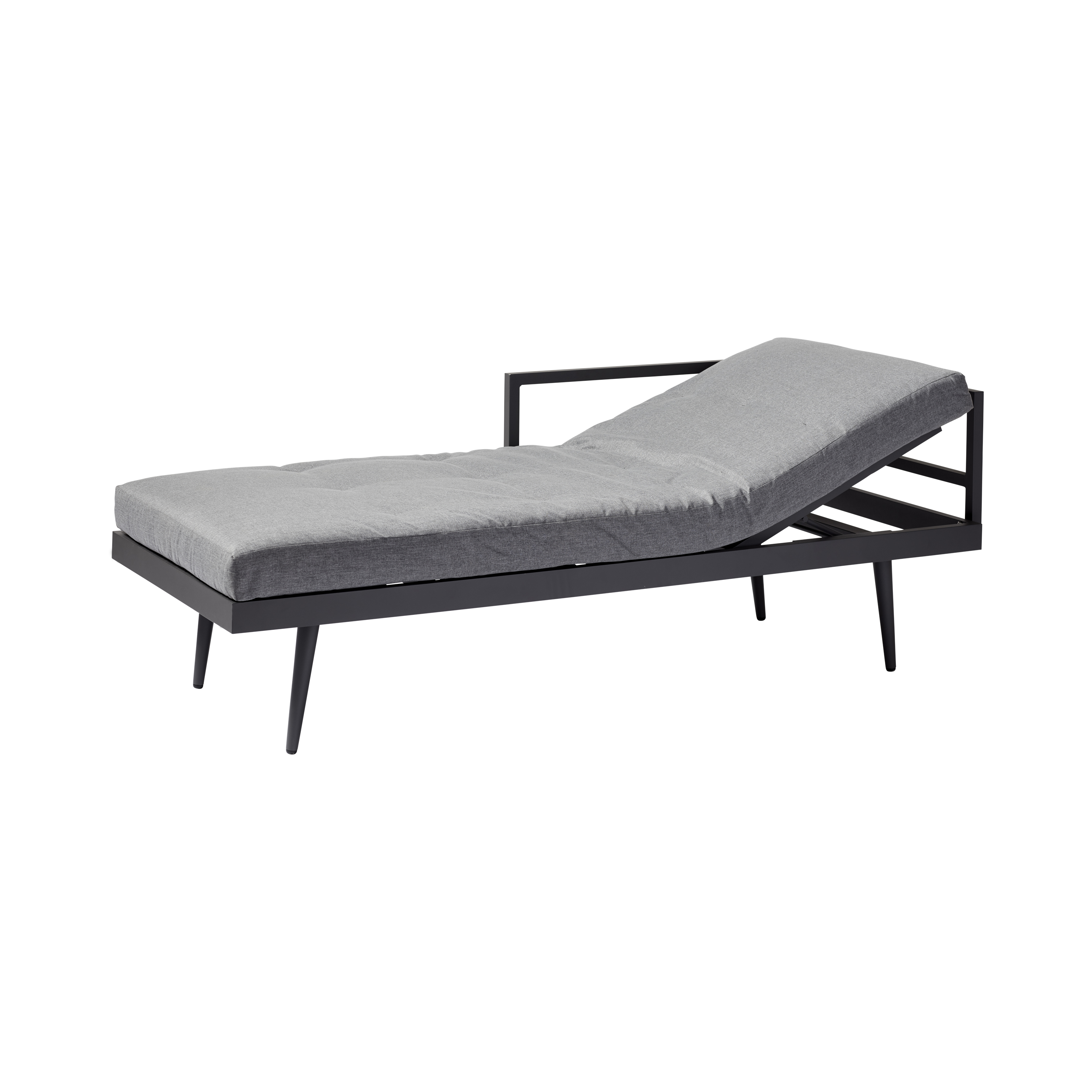 Erhältlich in mehreren Varianten – hier mit einem anthrazitfarbenen Aluminiumgestell und grauen Polyesterkissen.
