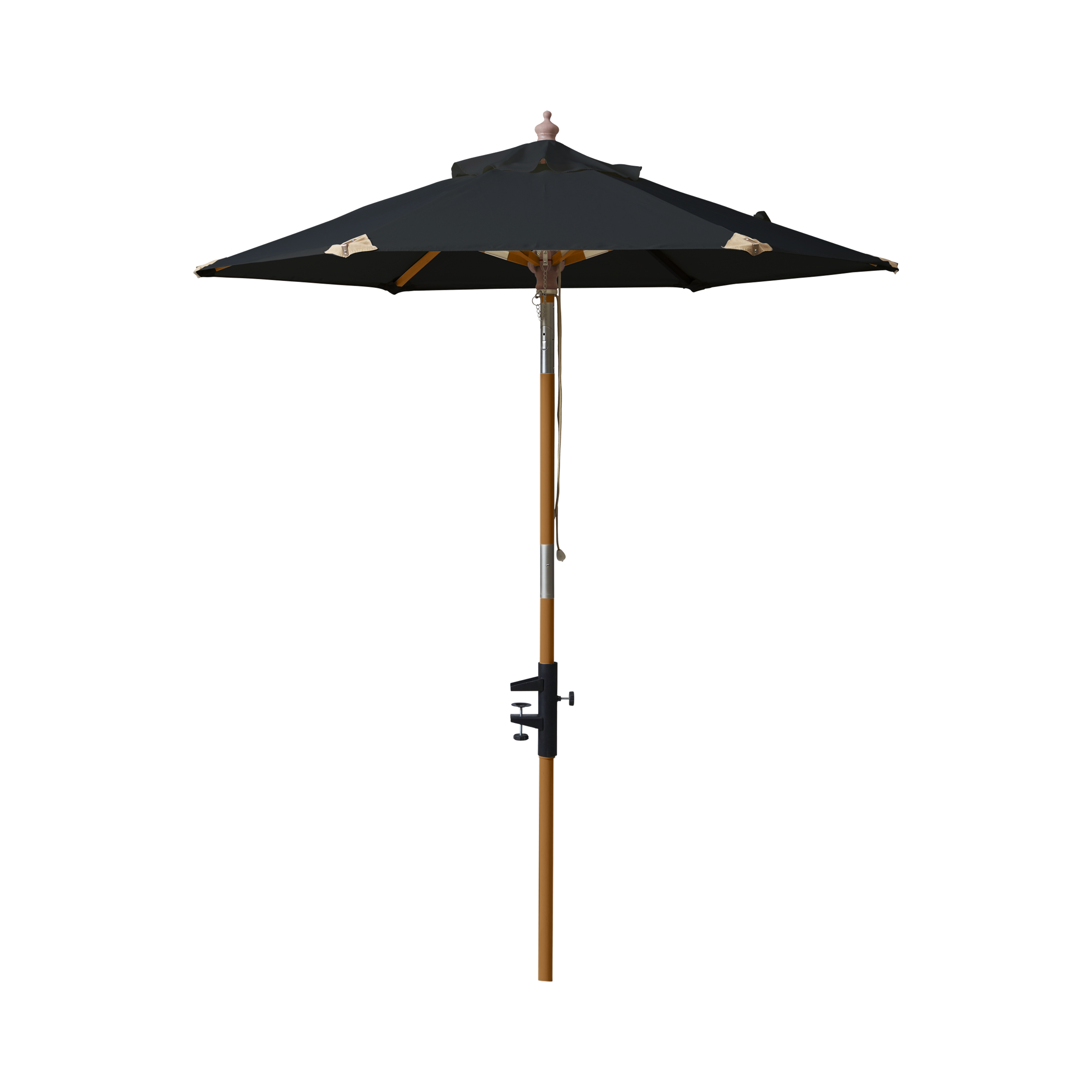 Der Balkonsonnenschirm ist in drei Varianten erhältlich – hier mit teakfarbenem Stock und schwarzem Tuch.