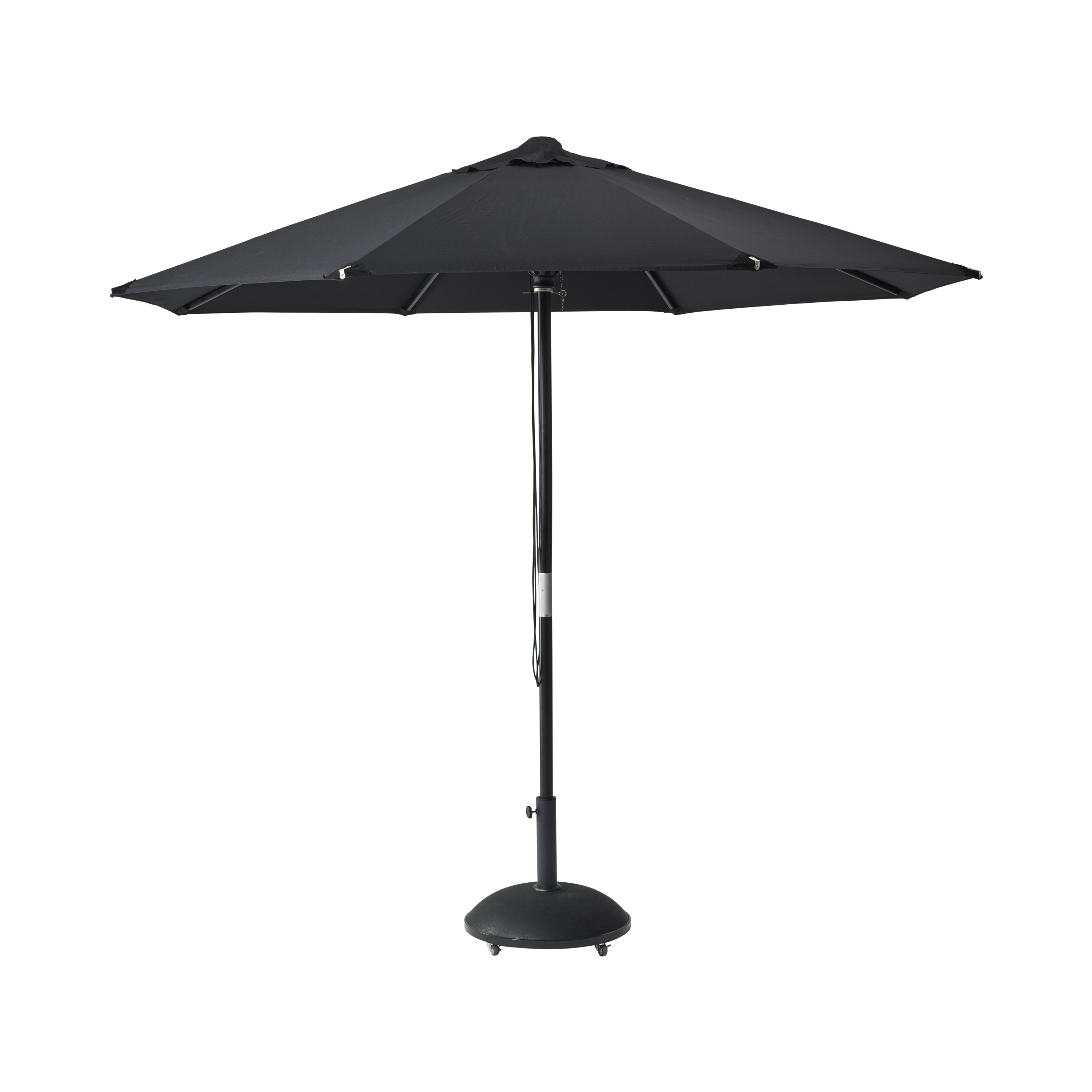 Ein runder Sonnenschirm in Vollschwarz – sowohl Stock als auch Bespannung – aus farbechtem Polyester und mit einem Durchmesser von 300 Zentimetern. Entwickelt für einen klaren, einheitlichen Look auf Terrasse, Balkon oder im Innenhof.