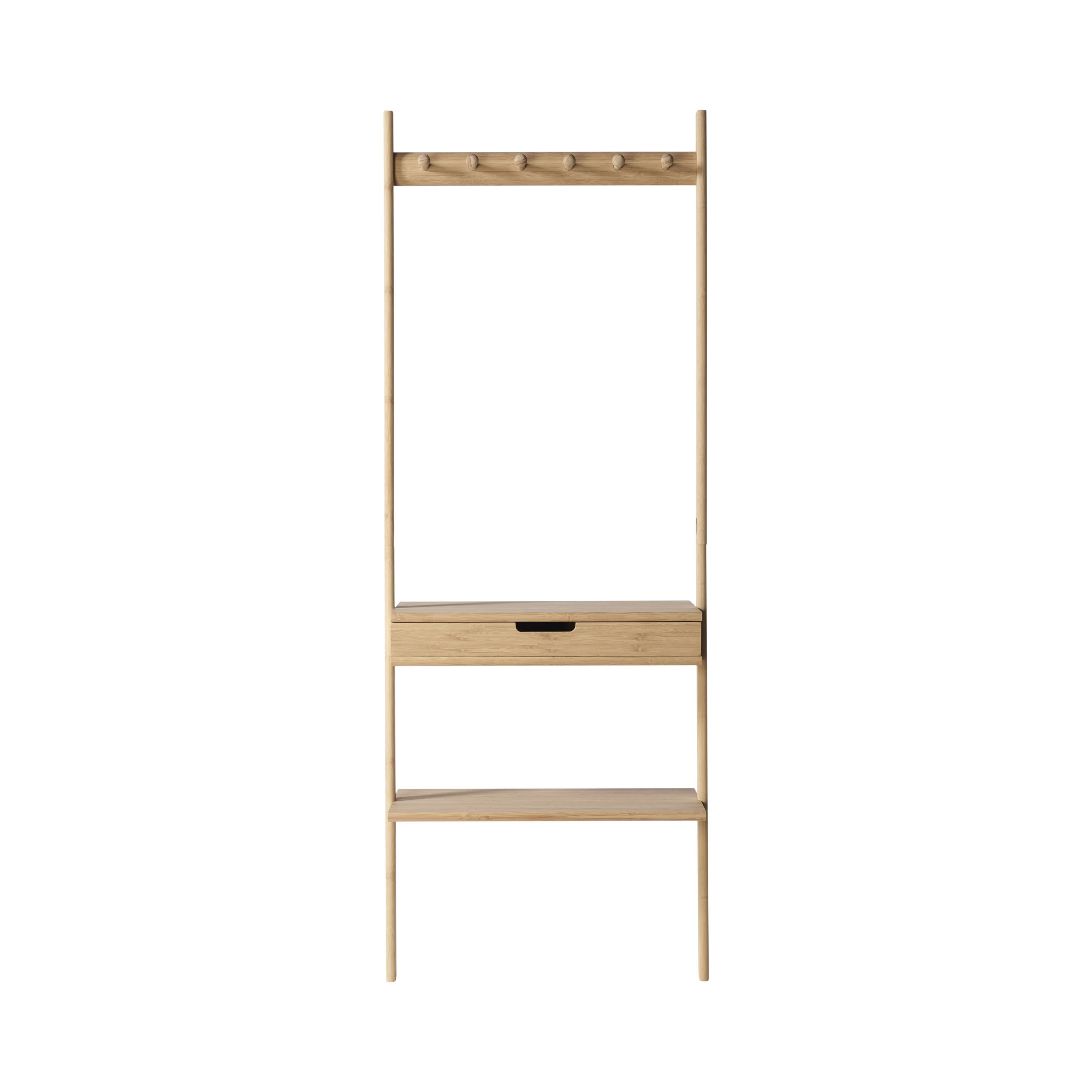 Ein leichtes und warm wirkendes Flurmöbel aus unbehandeltem Bambus, entwickelt für kleinere Wohnungen und städtisches Wohnen. Die offenen Regale sammeln Alltagsgegenstände und verleihen dem Eingangsbereich eine natürliche, einladende Ruhe.