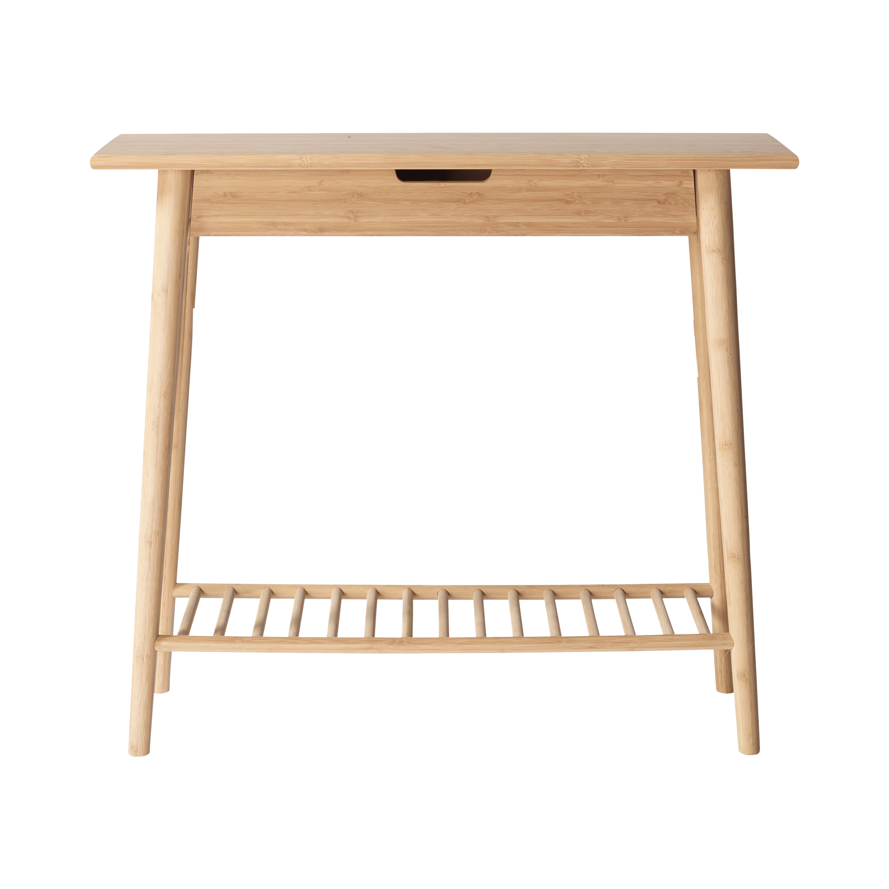 Das schmale Format macht den Tisch ideal für kleinere Räume und schmale Durchgänge. Die breite Schublade im oberen Bereich bietet diskreten Stauraum für Alltagsgegenstände, während die untere Ablage Platz für Körbe, Schuhe, Bücher oder persönliche Lieblingsstücke schafft. Eine praktische Lösung, die zugleich zu einem ruhigen und aufgeräumten Erscheinungsbild beiträgt.