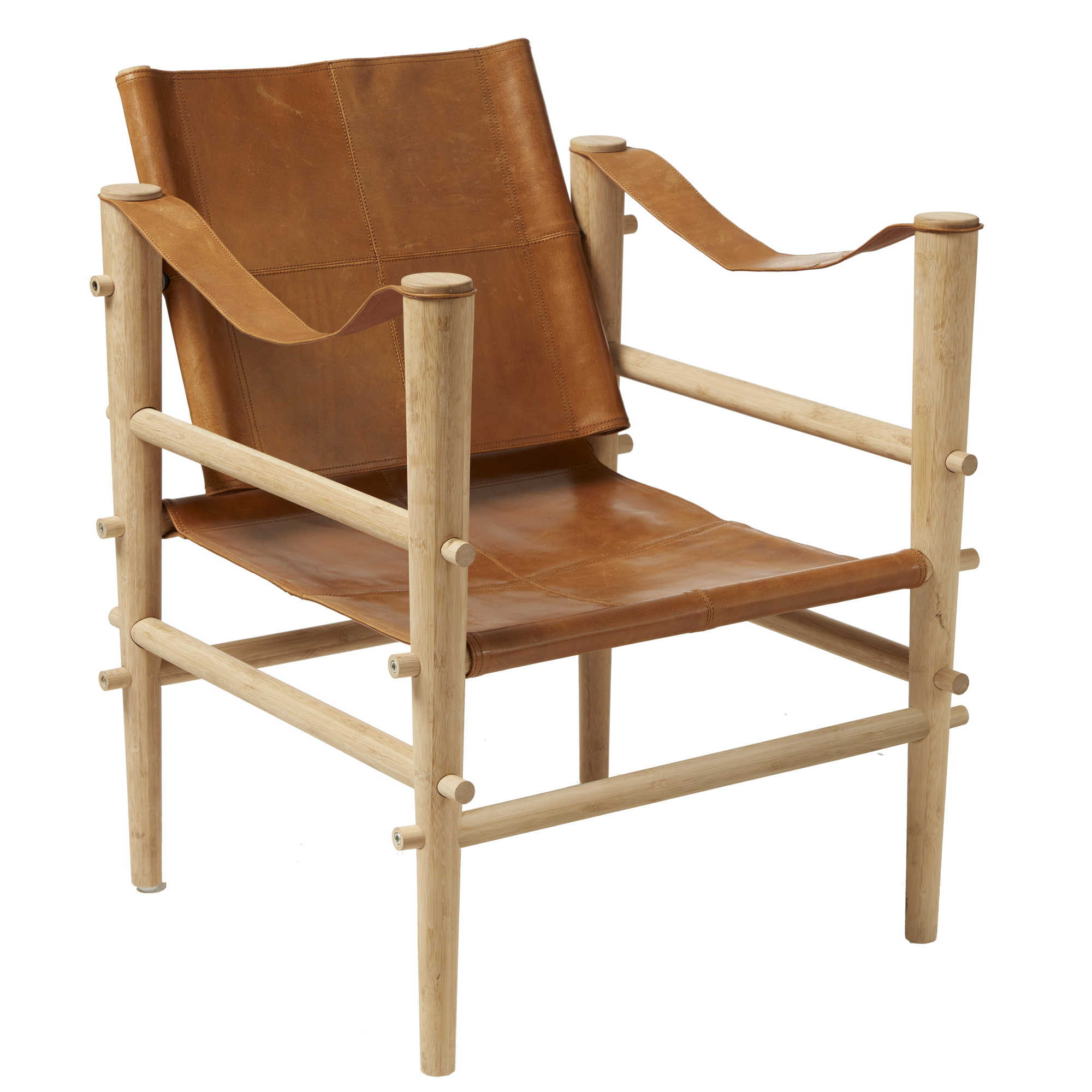 Inspiriert vom klassischen Safaristuhl. Ein entspanntes und charakterstarkes Möbel aus Bambus und Leder, geschaffen für Ruhe, Nähe und Komfort.
