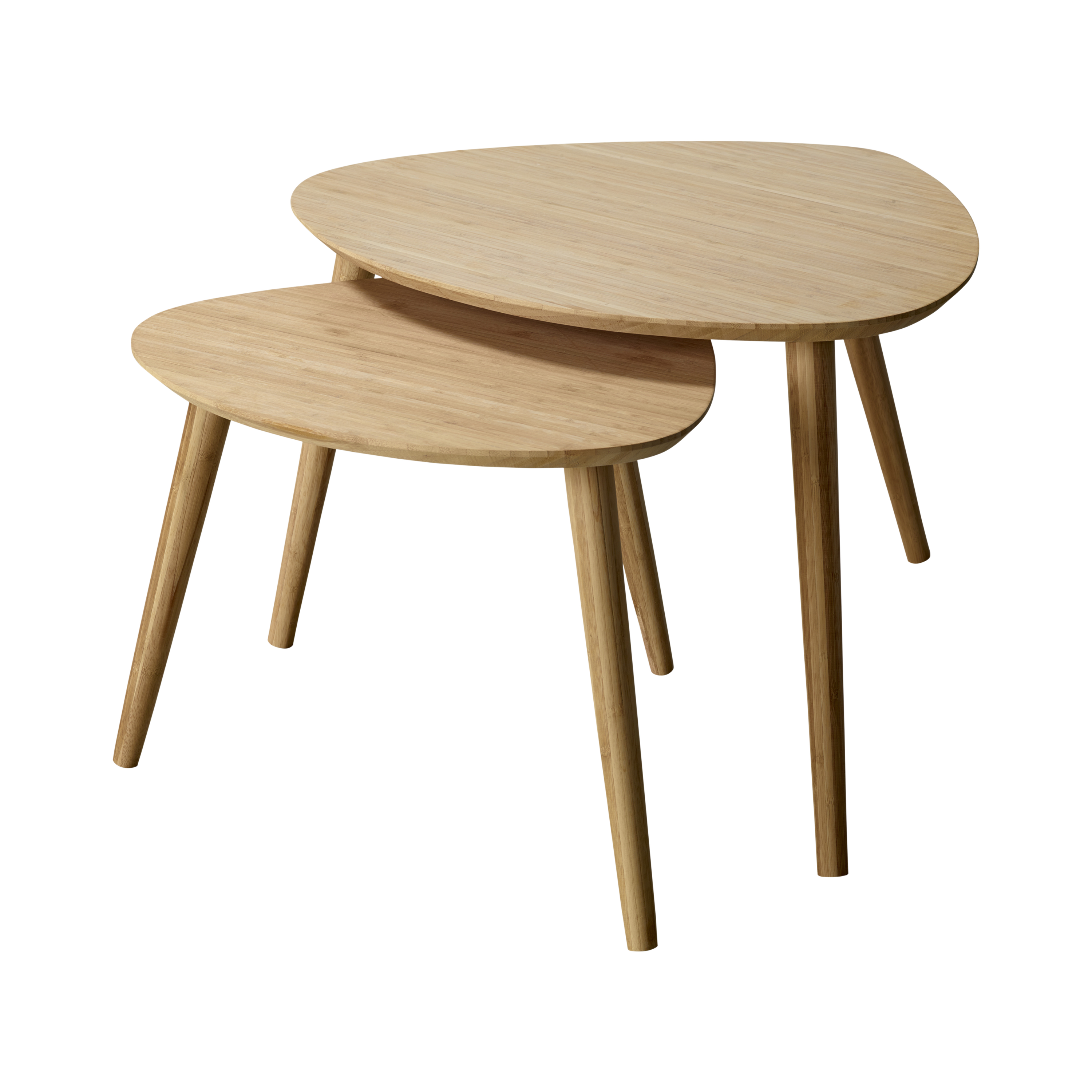 Zwei Beistelltische in unterschiedlicher Höhe mit einer klaren, organischen Formensprache – flexibel einsetzbar und aus Bambus gefertigt, der eine warme und natürliche Ausstrahlung verleiht.
