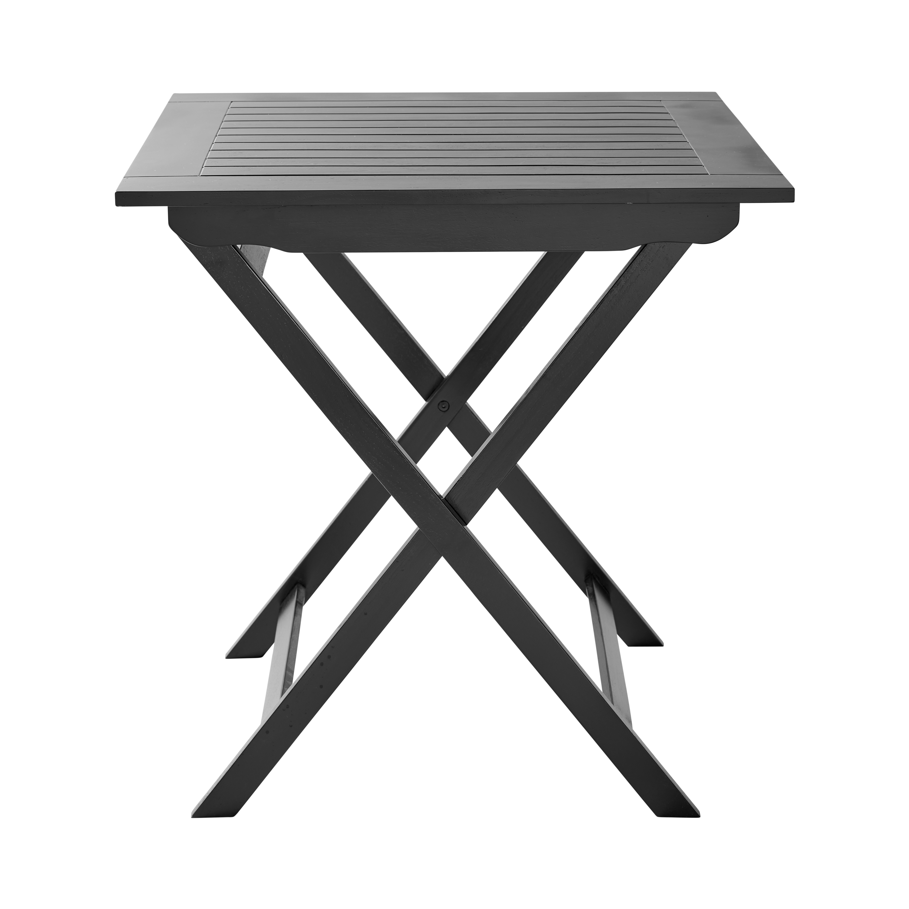 Ein leichter und eleganter Klapptisch aus schwarz lackiertem Mahagoni, ideal für kleine Balkone, kompakte Terrassen und intime Außenbereiche, in denen Flexibilität und nordische Schlichtheit im Mittelpunkt stehen.