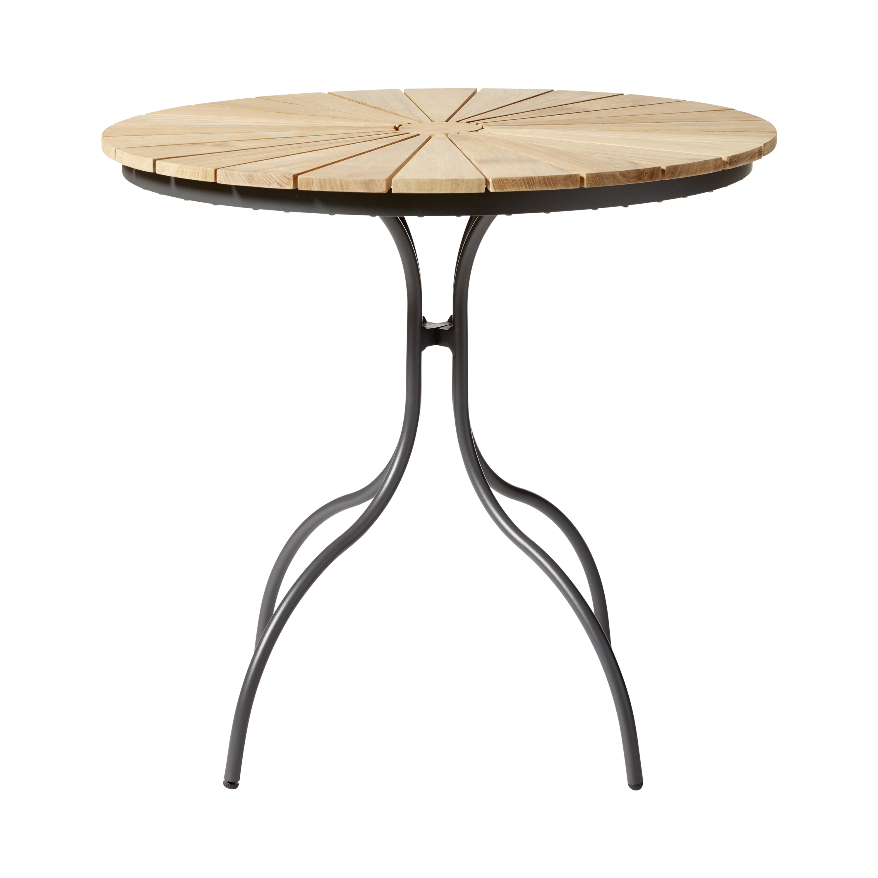 Der Cafétisch hat einen Durchmesser von 80 Zentimetern – mit anthrazitfarbenem Gestell und Platz für zwei bis drei Personen. Ein Tisch, der perfekt auf Balkone, kleine Terrassen und Cafés passt, wo der Platz begrenzt, aber die Atmosphäre alles ist.
