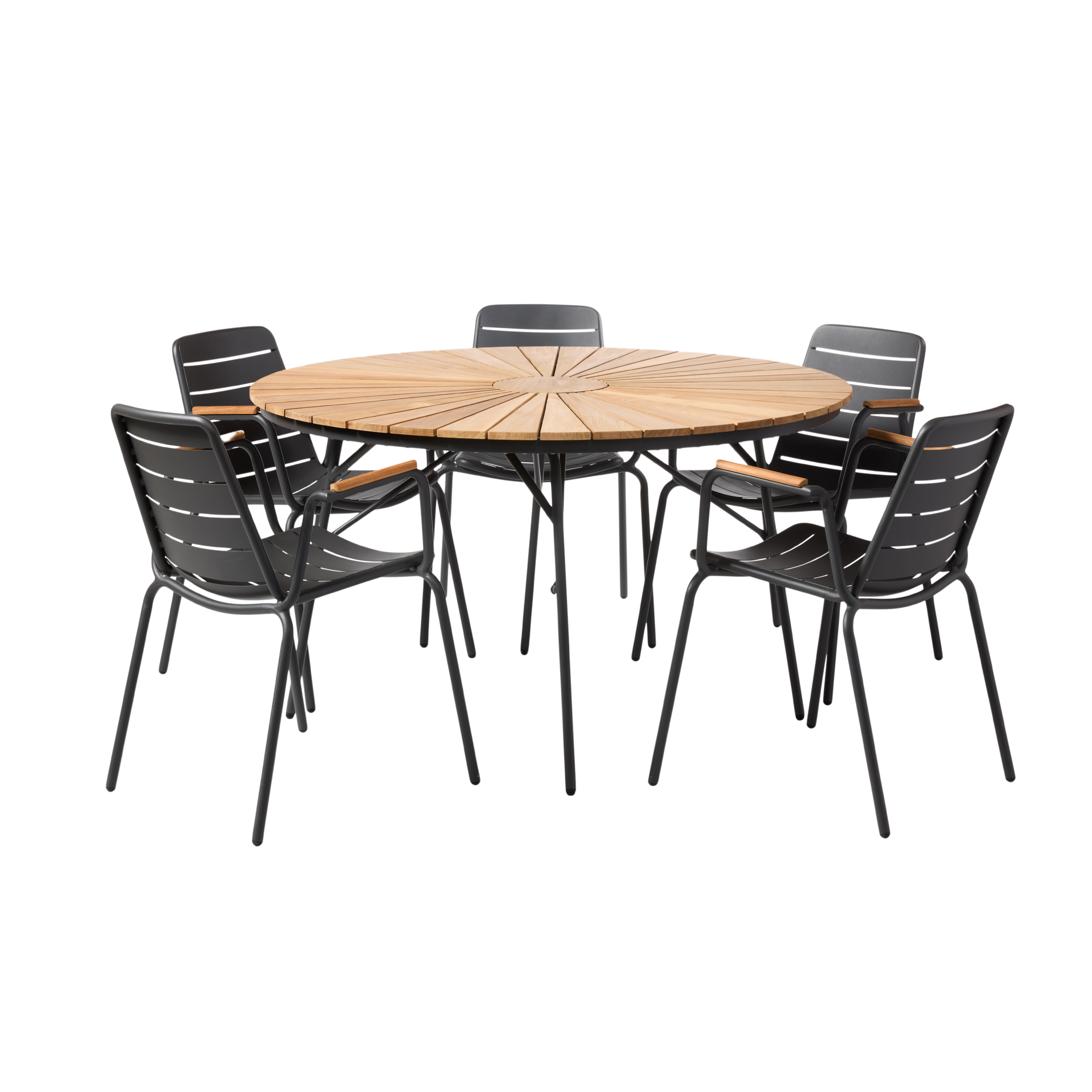 Der runde Ellen-Tisch bietet reichlich Platz und schafft einen natürlichen Mittelpunkt. Die Teaklamellen verleihen Wärme und eine klassische Ausstrahlung, während das anthrazitgraue Gestell einen ruhigen und modernen Kontrast bildet, der das Gesamtbild harmonisch ausbalanciert.