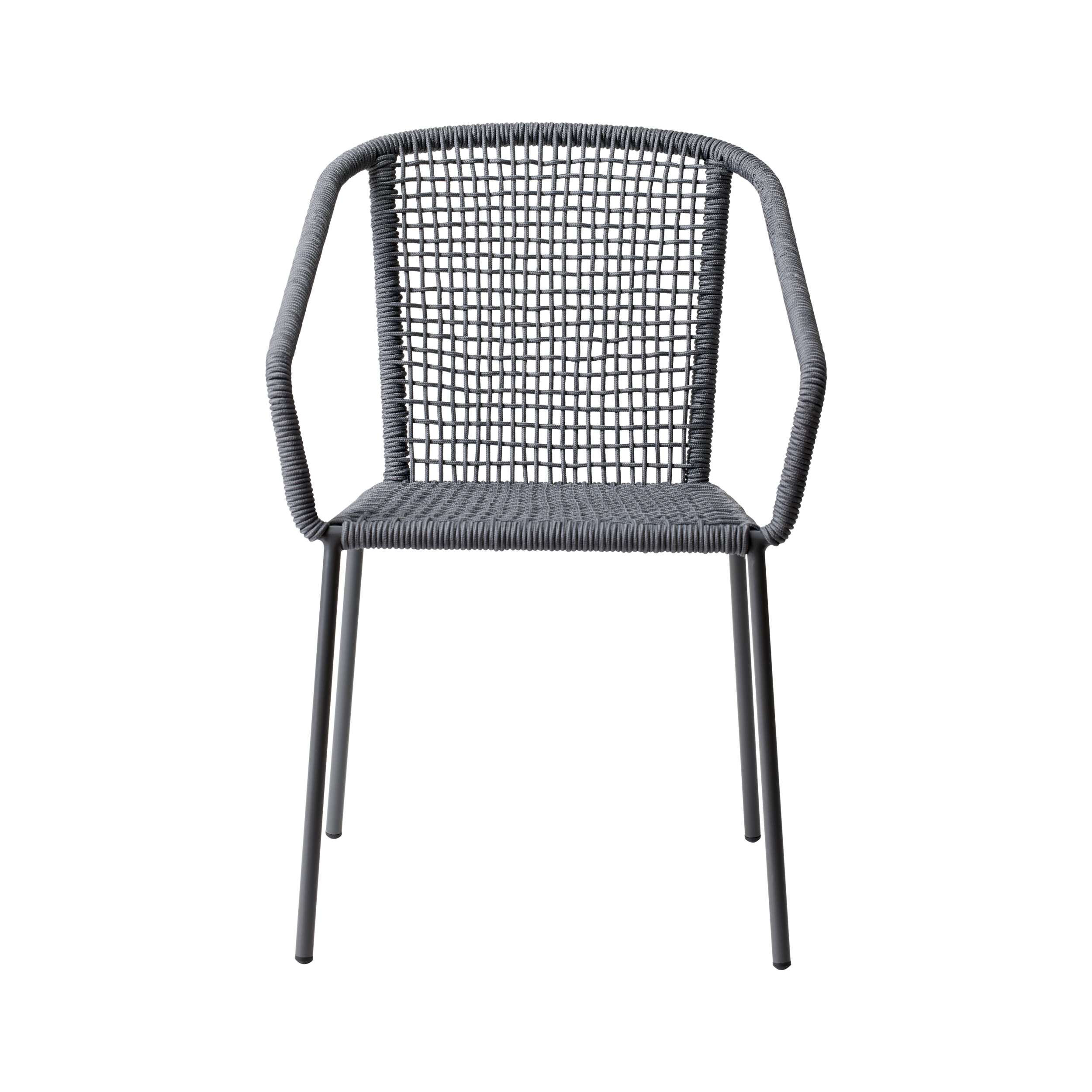 Der Stuhl verfügt über einen schlanken Aluminiumrahmen in Anthrazitgrau, kombiniert mit einer passenden geflochtenen Sitzfläche und Rückenlehne, die dem Stuhl eine leichte und luftige Ausstrahlung verleihen.