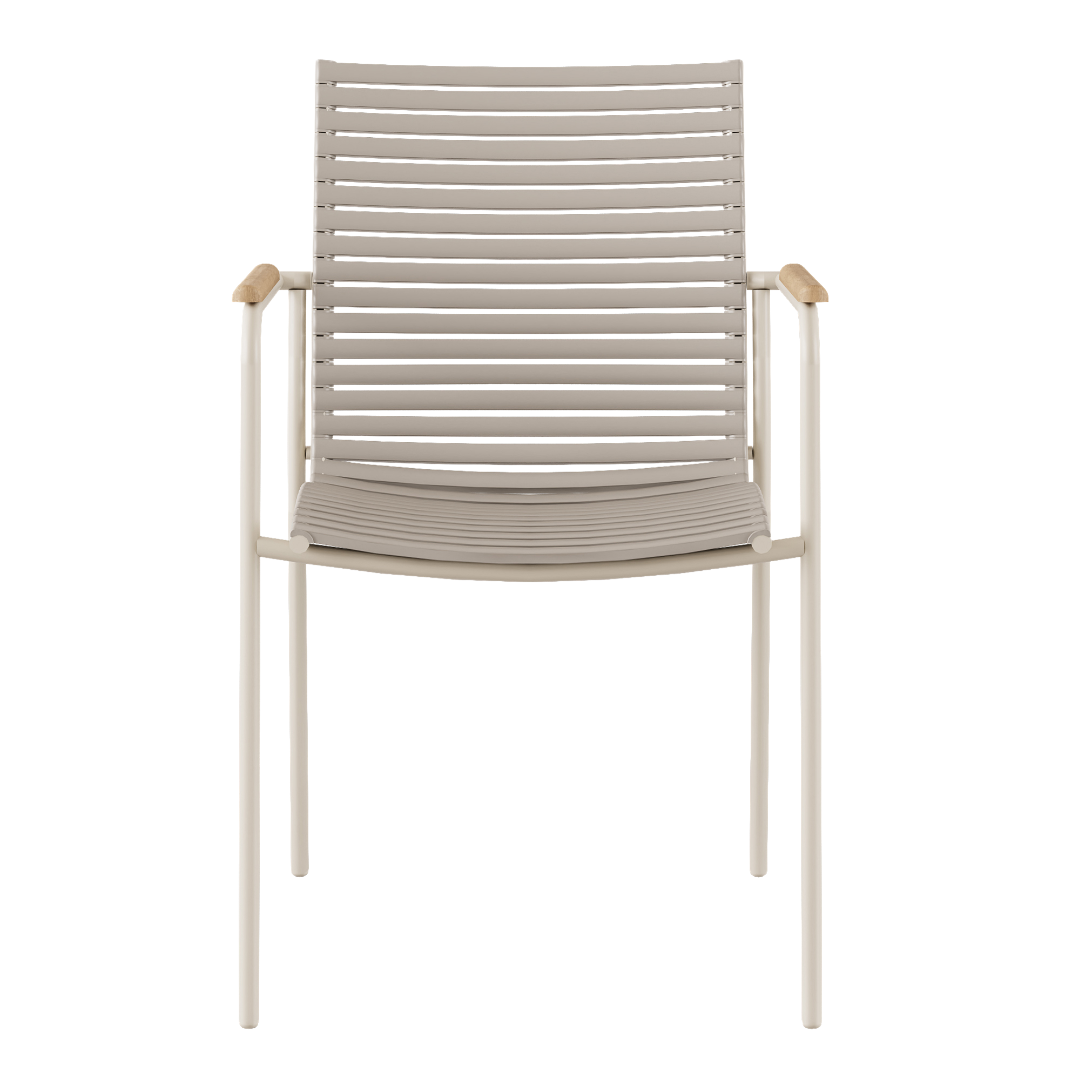 Ein eleganter und leichter Stuhl aus sandfarbenem Aluminium mit Armlehnen aus Teak und schmalen, wetterbeständigen Lamellen — geschaffen für Außenbereiche mit einem hellen, ruhigen und modernen Ausdruck.
