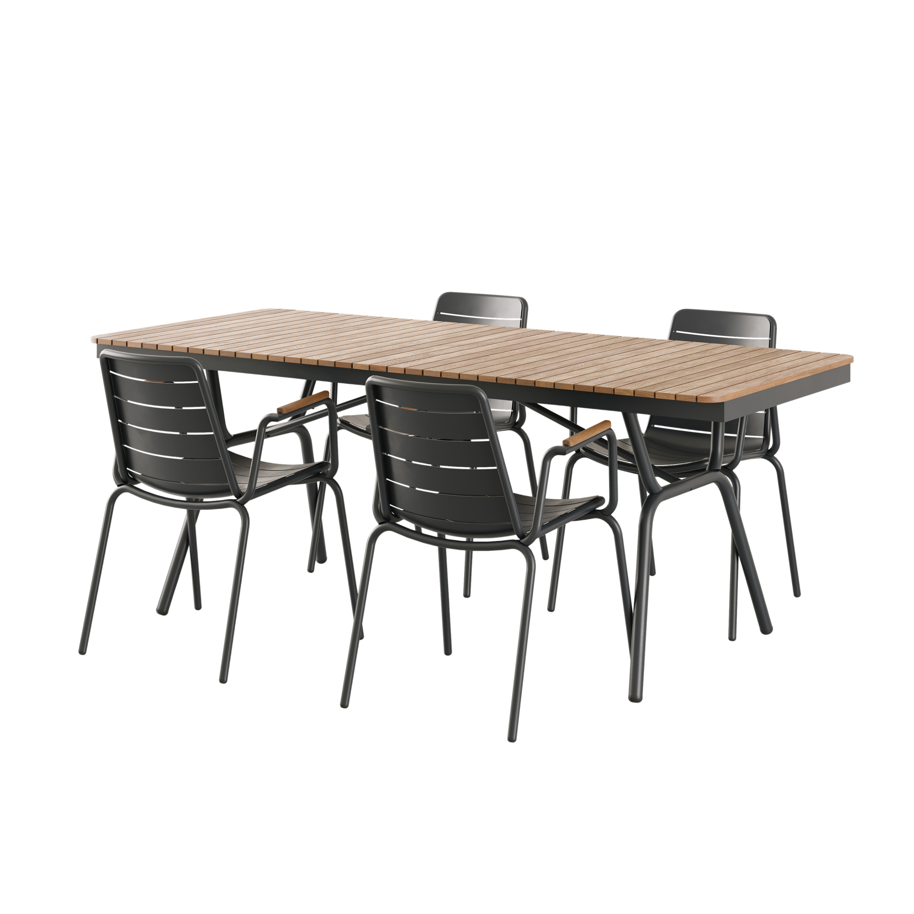 Das Set besteht aus Teakholzlamellen in Kombination mit einem anthrazitfarbenen, pulverbeschichteten Gestell, das für ein modernes und ausgewogenes Erscheinungsbild sorgt. Die klaren Linien und der dunkle Farbton bilden einen schönen Kontrast zur Wärme des Holzes und machen das Set vielseitig einsetzbar in unterschiedlichen Außenbereichen.