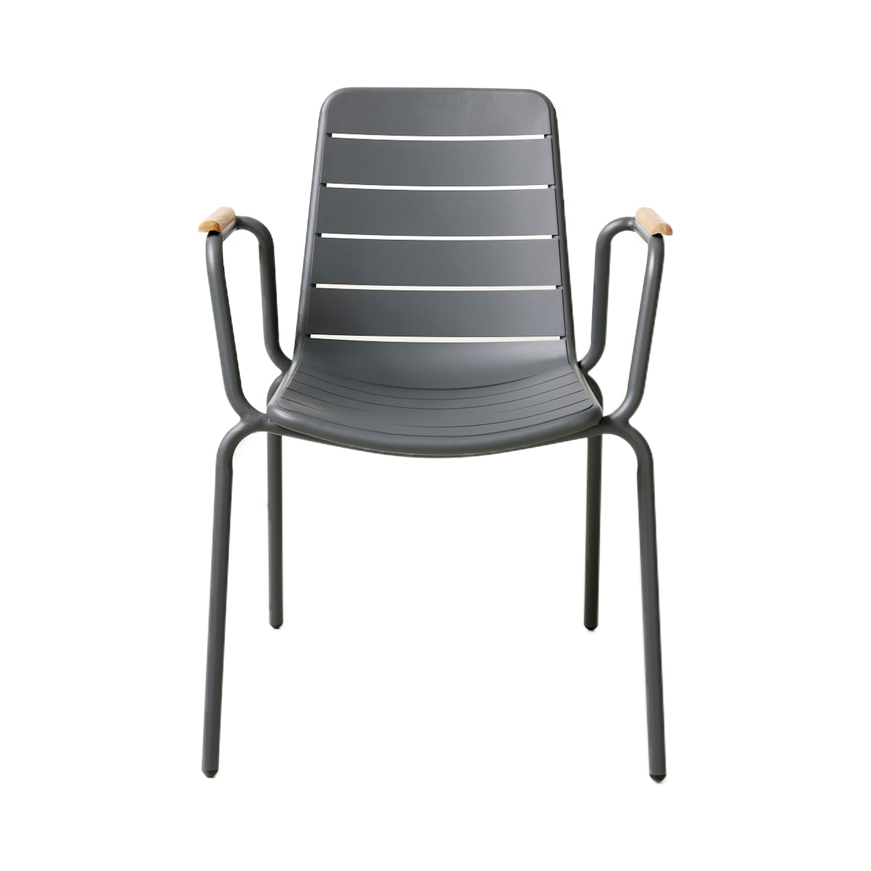 Er ist aus Teakholzlamellen und einem pulverbeschichteten Aluminiumgestell gefertigt, das dem Stuhl Stabilität verleiht, ohne ihn schwer wirken zu lassen.
