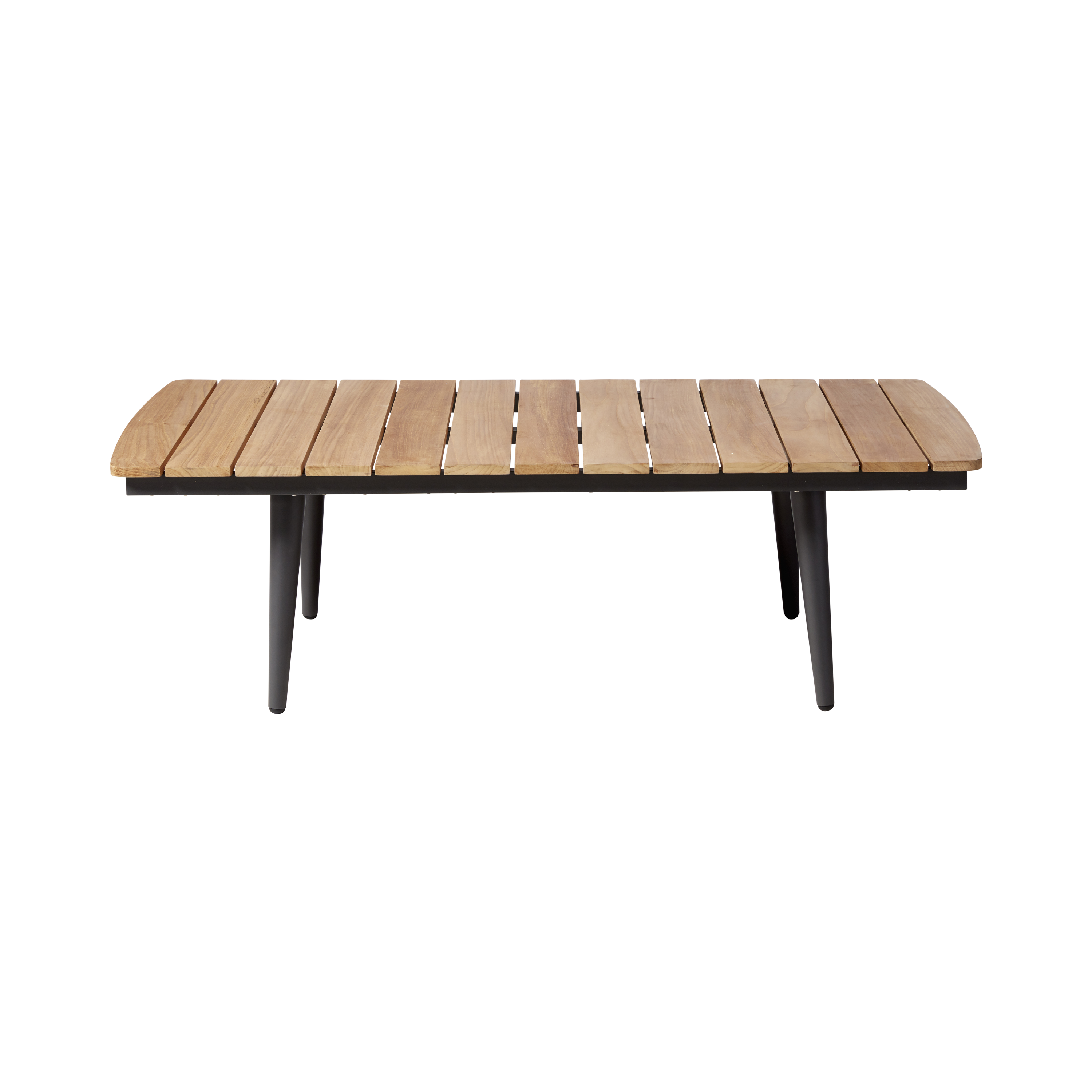 Ein schlichtes und funktionales Tischdesign, das anthrazitfarbenes Aluminium für Leichtigkeit und Haltbarkeit mit einer Tischplatte aus exklusivem Teakholz kombiniert.