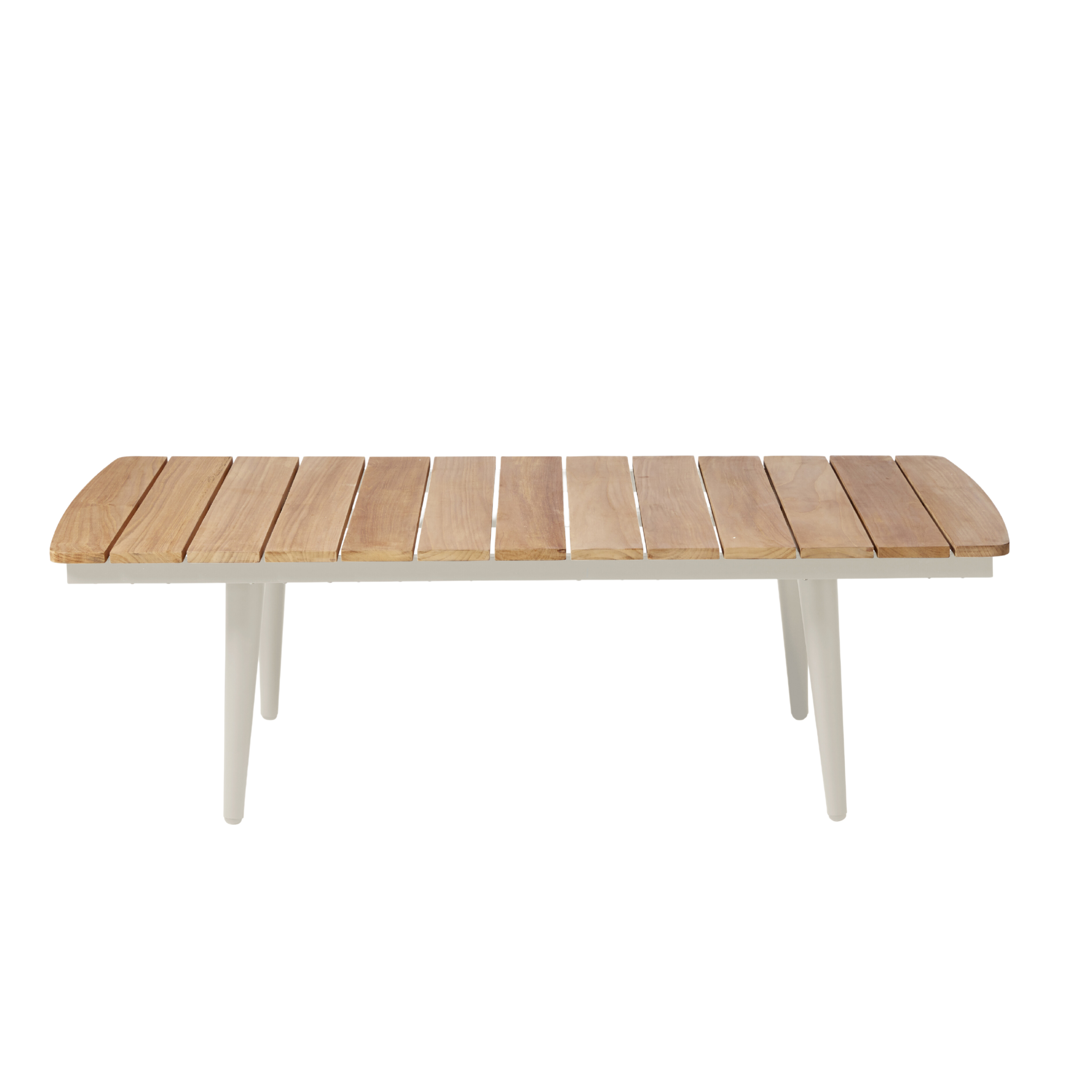 Ein schlichtes und funktionales Tischdesign, das sandfarbenes Aluminium für Leichtigkeit und Haltbarkeit mit einer Tischplatte aus exklusivem Teakholz kombiniert.