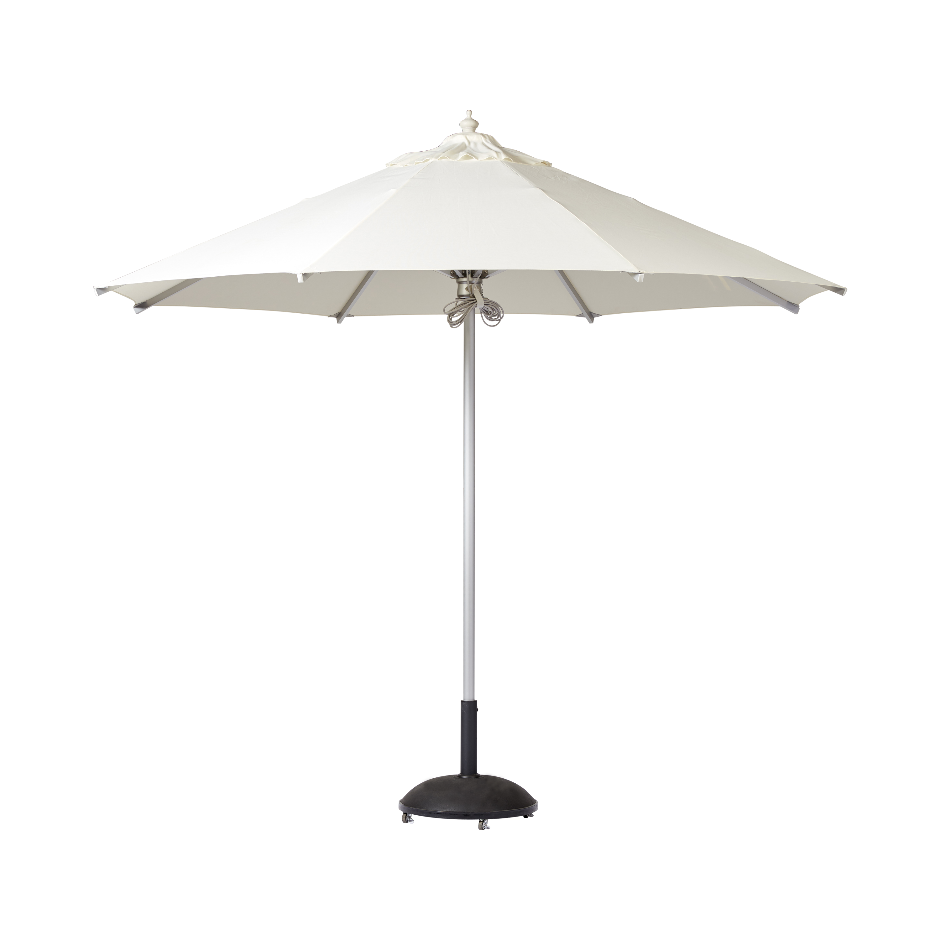 Ein runder Sonnenschirm in Off-White, genäht aus farbechtem Olefin und mit einem Durchmesser von 330 Zentimetern – geschaffen für Schatten auf der Terrasse, im Garten oder über dem Essbereich im Freien.