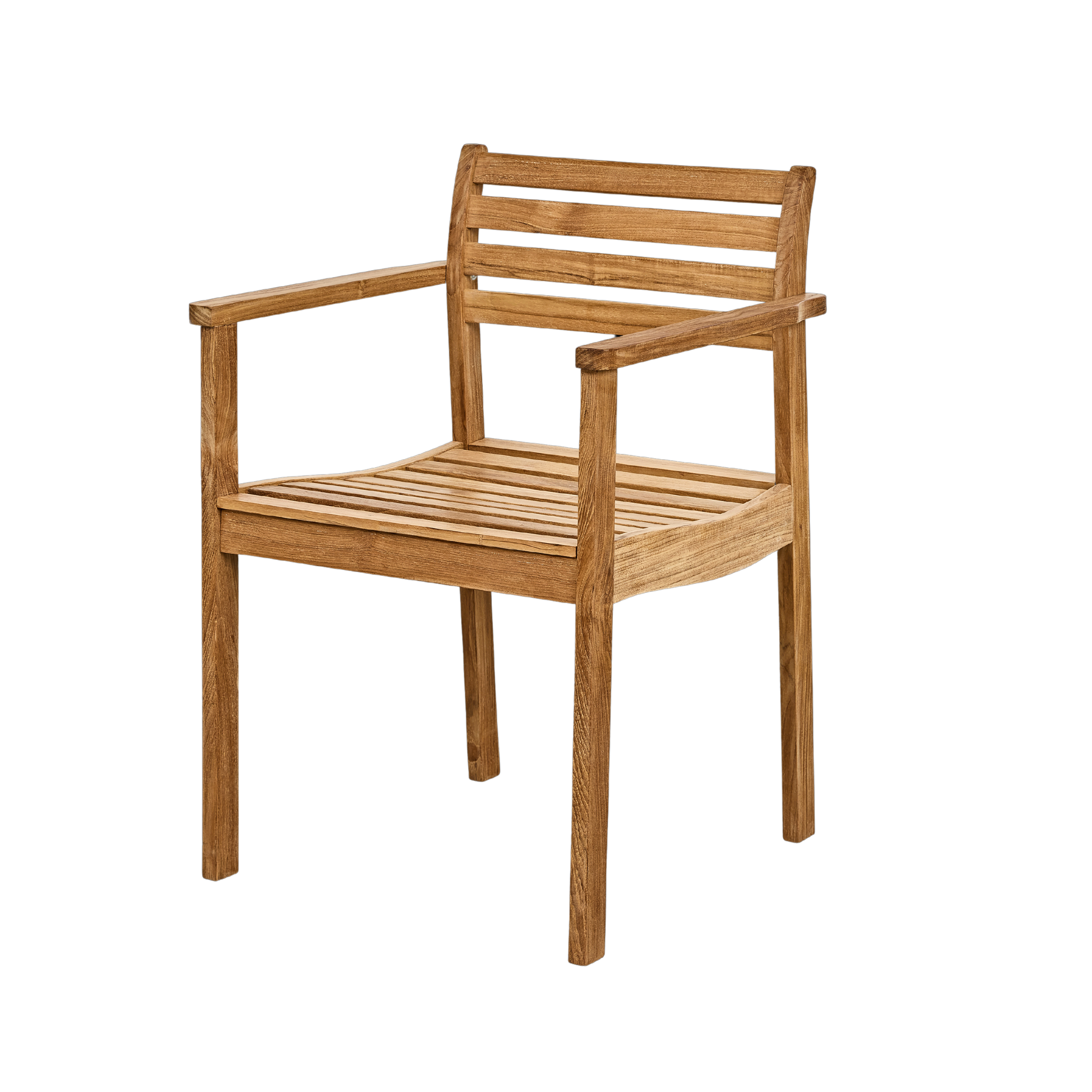 Der Stuhl ist aus Teak gefertigt, wobei die schöne Maserung des Holzes deutlich hervortritt und der Oberfläche ein lebendiges Spiel mit Tiefe und Charakter verleiht. Mit der Zeit entwickelt Teak eine weiche, silbergraue Patina, wenn es nicht regelmäßig geölt wird – ein natürlicher Prozess, der dem Stuhl Charakter und Tiefe verleiht.